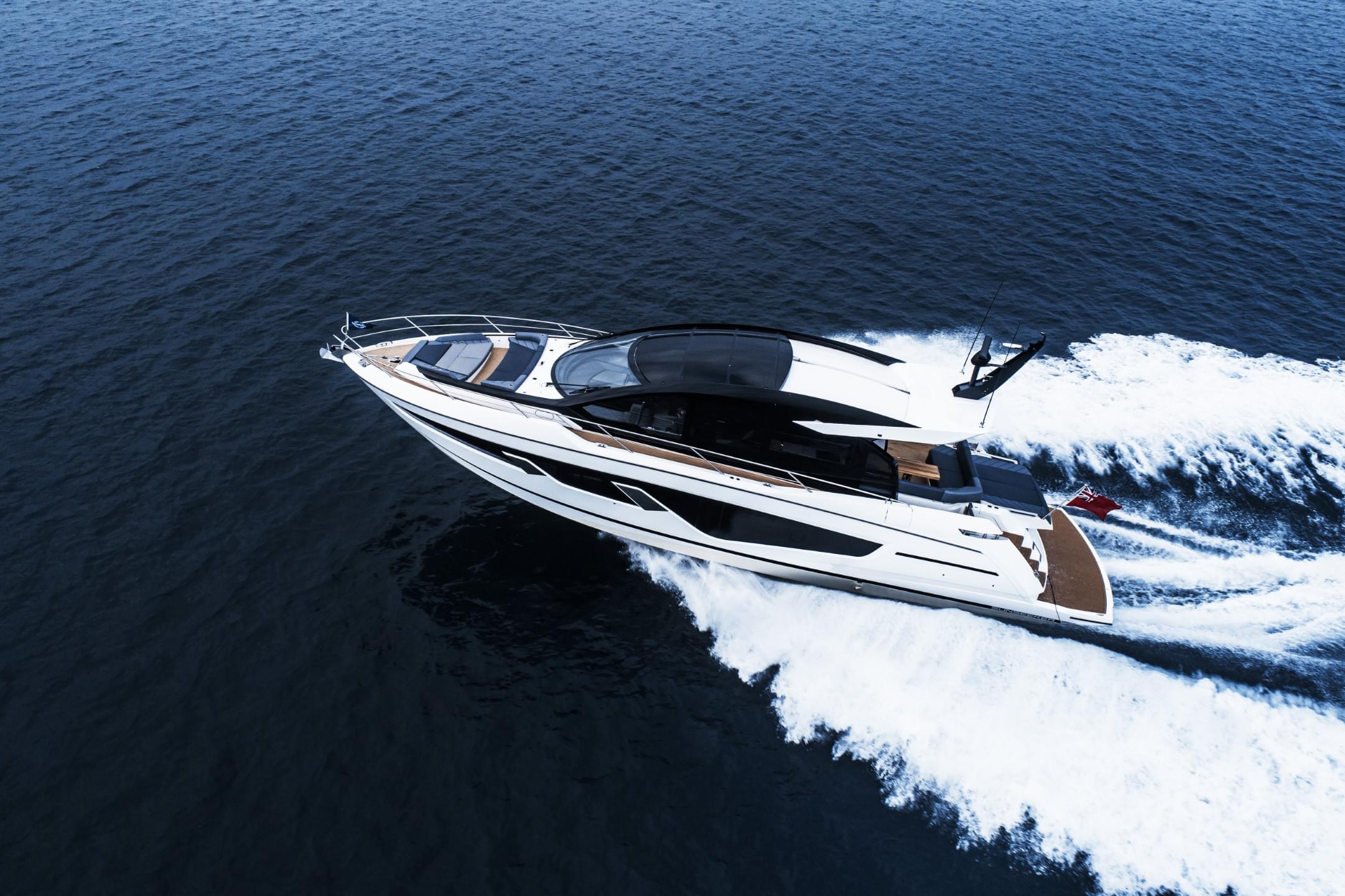 A single piece windshield and newly designed carbon fibre sunroof floods the main deck with an abundance of natural light, bringing the owner closer to the elements than previous models. The dramatic exterior is a striking blend of tinted glazing, teak, carbon fibre and polished stainless steel, perfectly balancing traditional Sunseeker design concepts with cutting-edge material innovation to create a dynamic performance model.